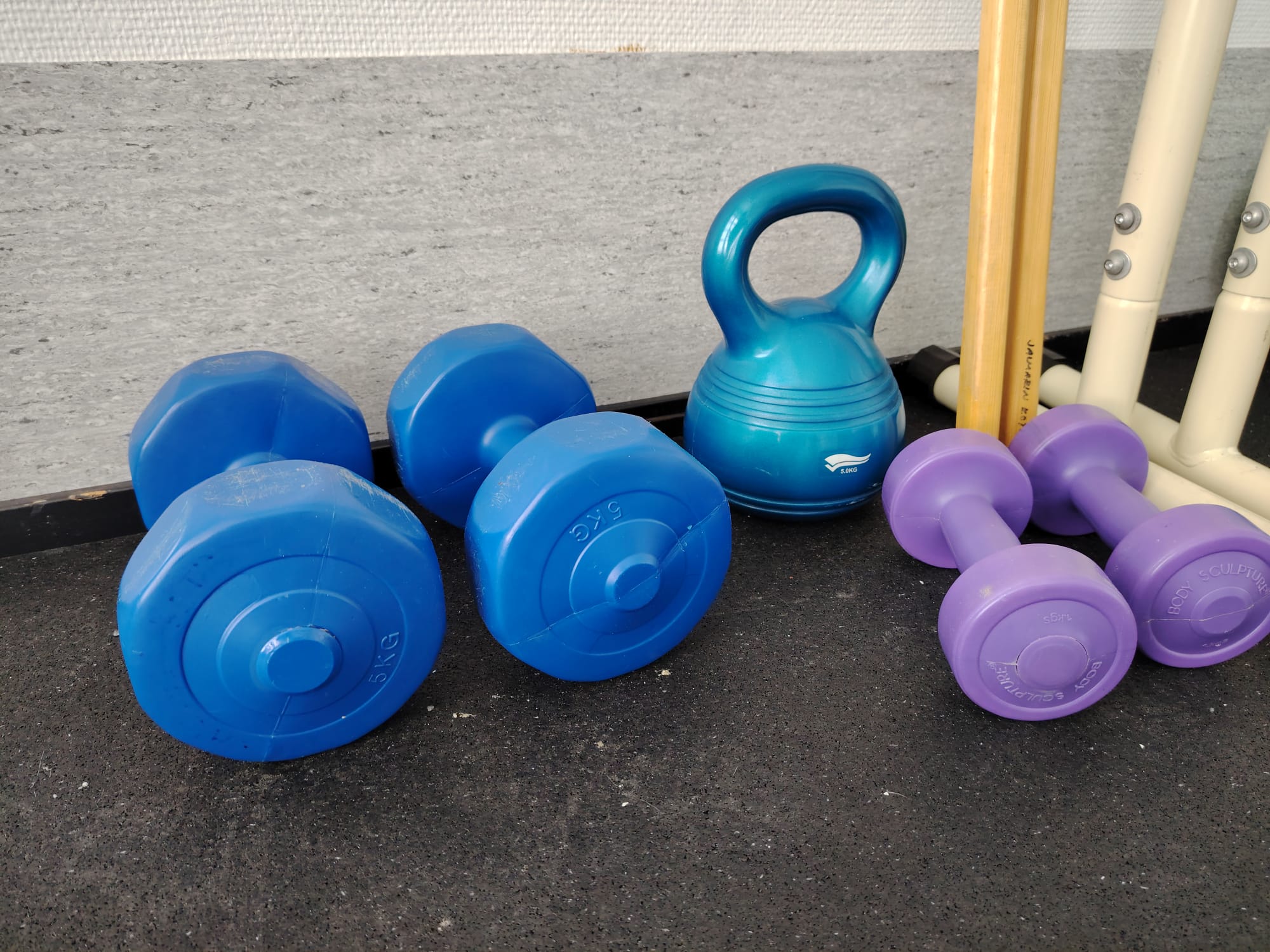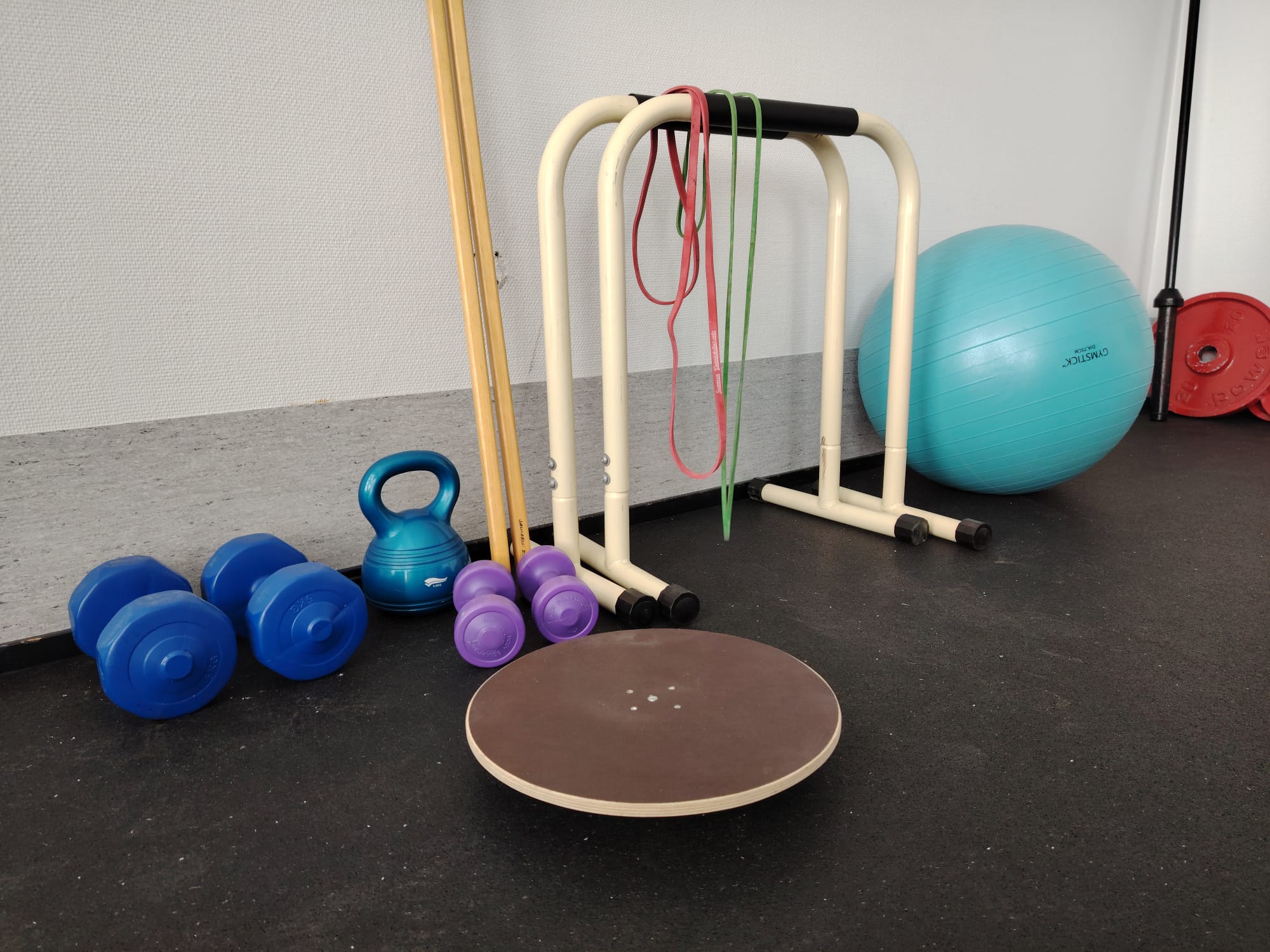 - jumppapalloja, mattoja ja kuminauhoja, kuntopallo
